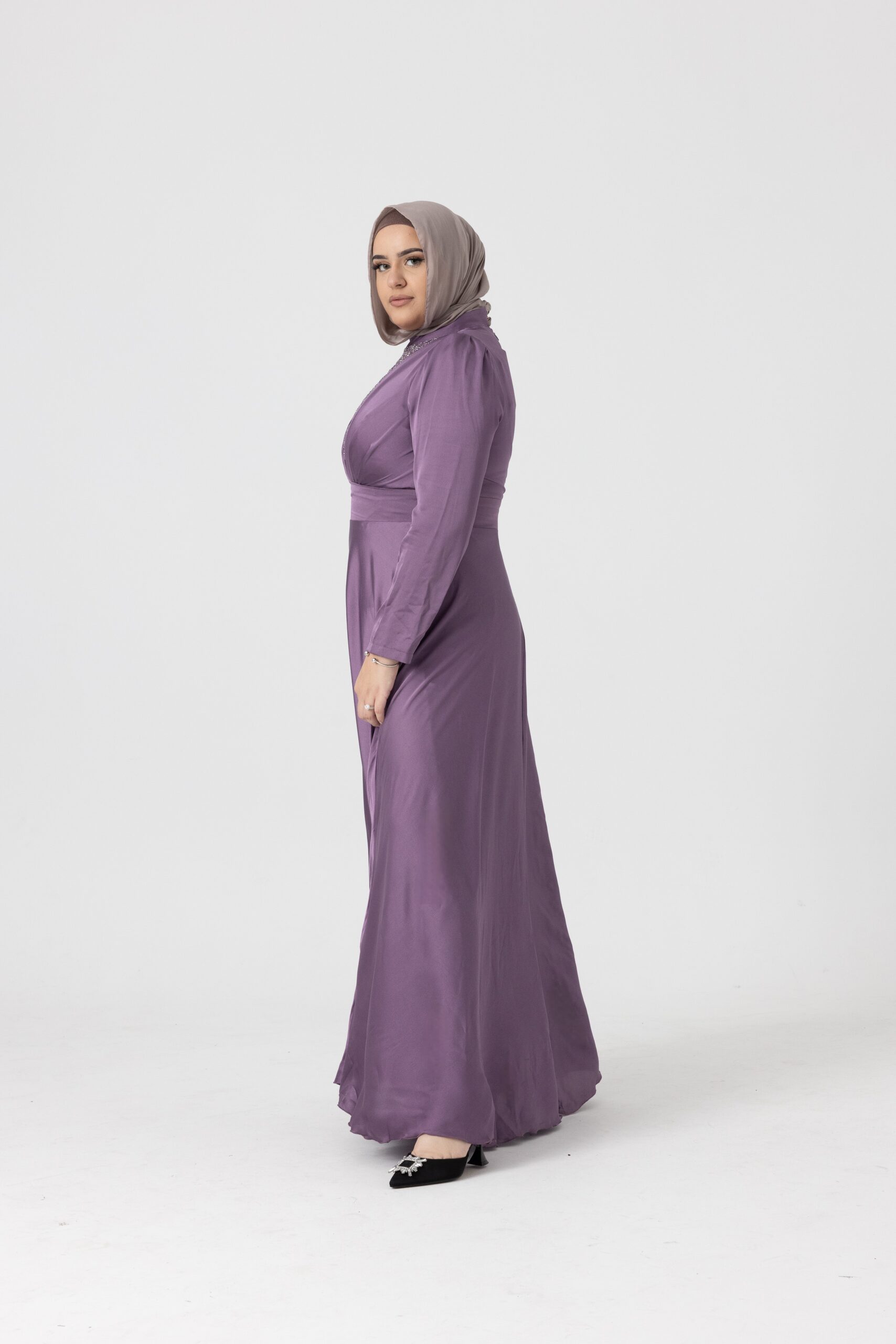 Our Batoola Violet dress flows elegantly to the floor, perfect for Eid and special occasions. It’s elegantly simple yet striking, with a unique design at the chest, It’s simple yet chic.