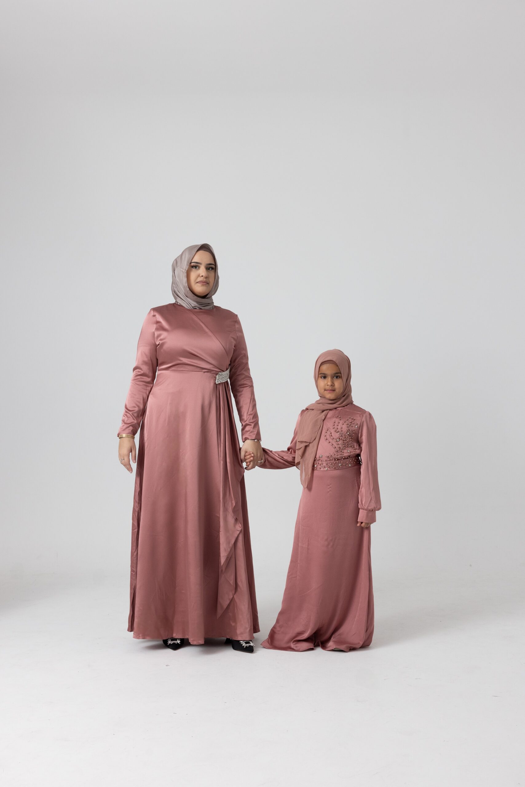 This gorgeous dress is modest and beautiful for children ages 8 to 12. This floor-length dress is ideal for celebrating Eid, takleef party, or a special occasion, it is made of sparkling metallic pink satin material, its embellished with pink pearls on the breast and a matching pearl belt. It’s the ideal option for any special occasion, allowing your child to shine with dignity and modesty.