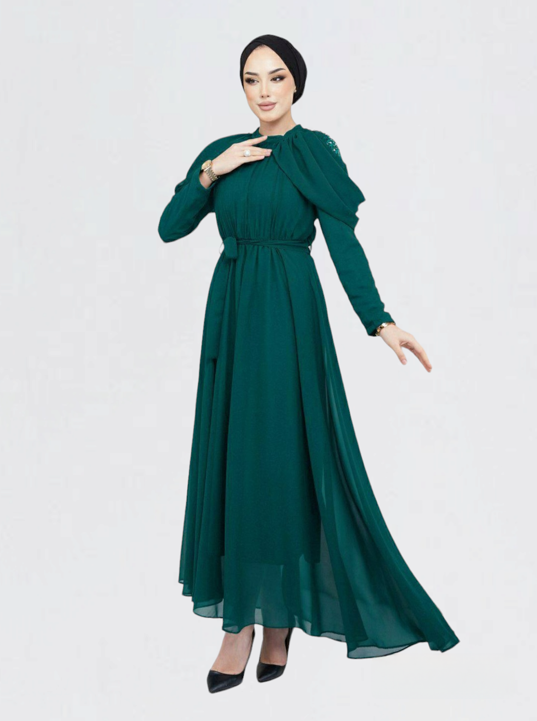 This emerald green dress is both modest and elegant, featuring a belt that defines the waist, the shoulders are adorned with delicate embroidery while a flowing fabric drapes gracefully over both shoulders, shimmering with sparkly details, adding a touch of glamour to this timeless piece