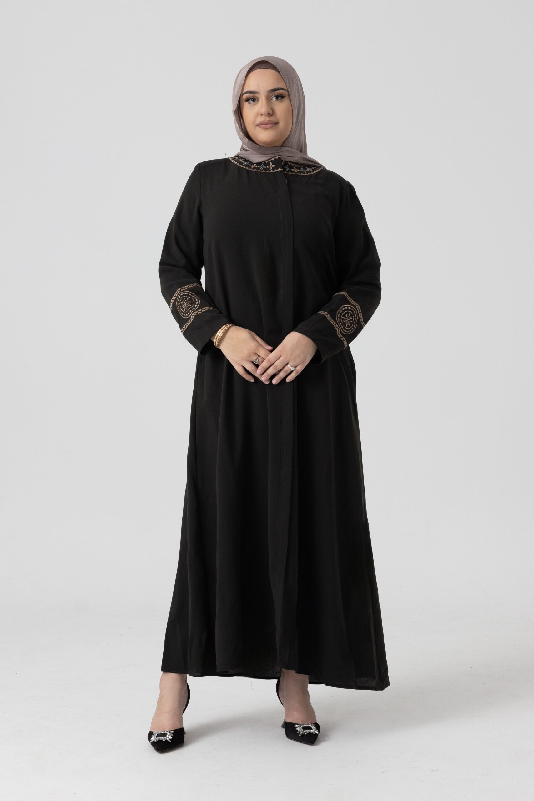 Step into modesty with our oversized olive abaya. This stunning piece features a zipper running from neck to hem, it has intricate golden designs along the wrist and neckline. Its length flows to the ground.